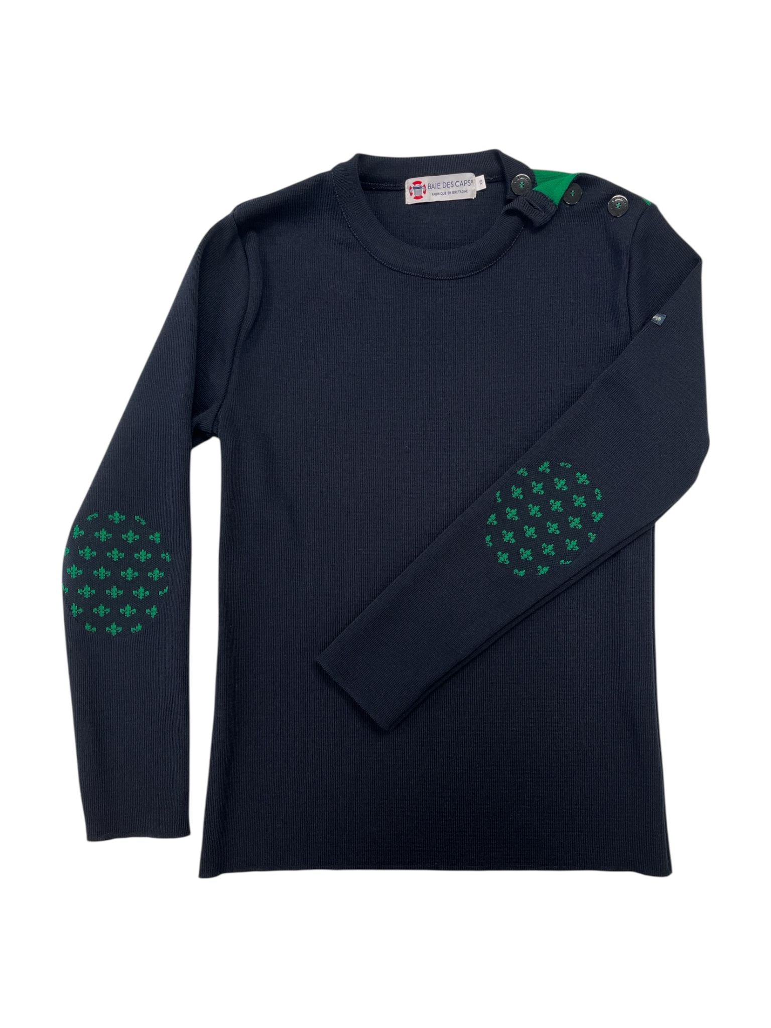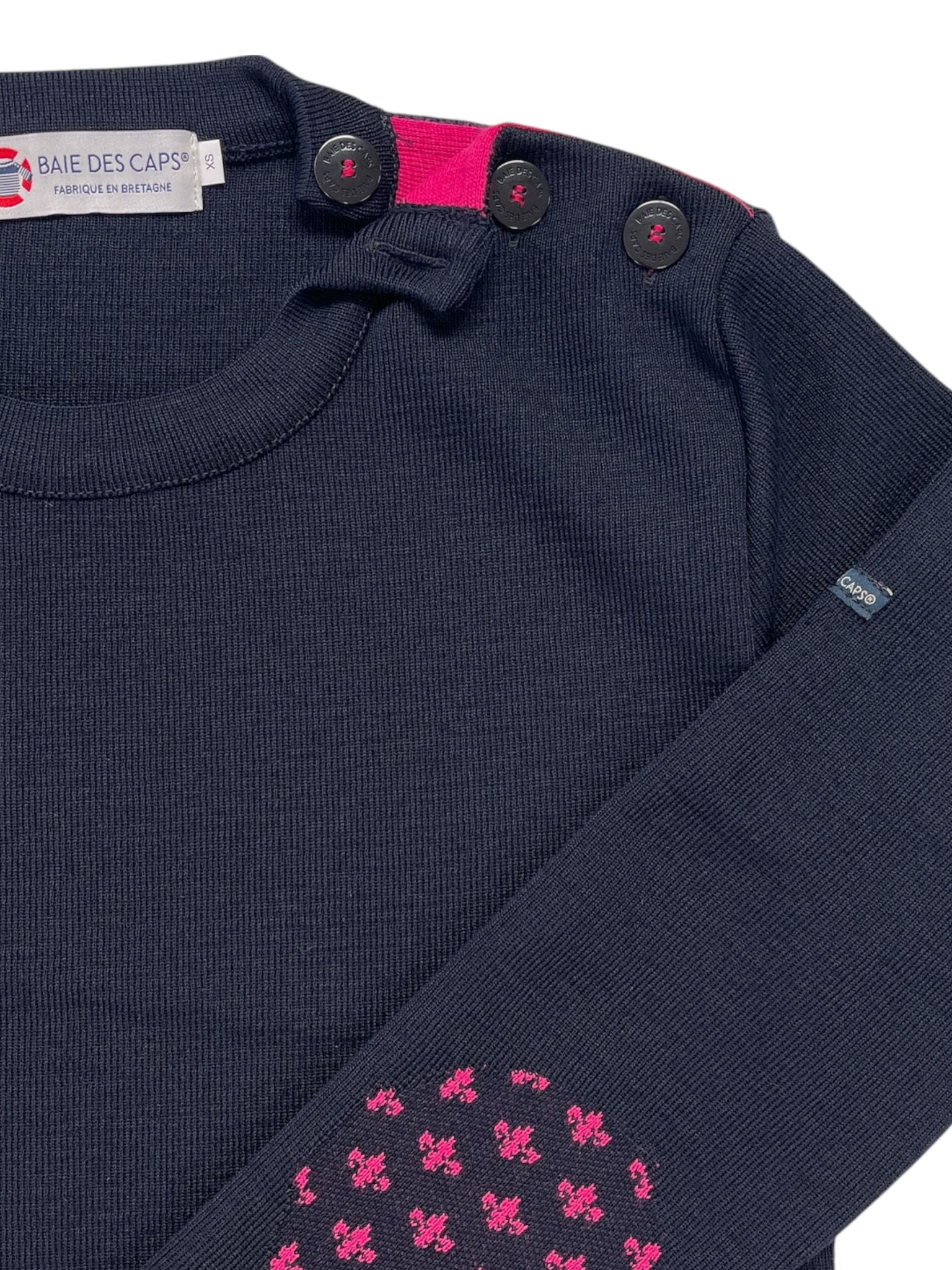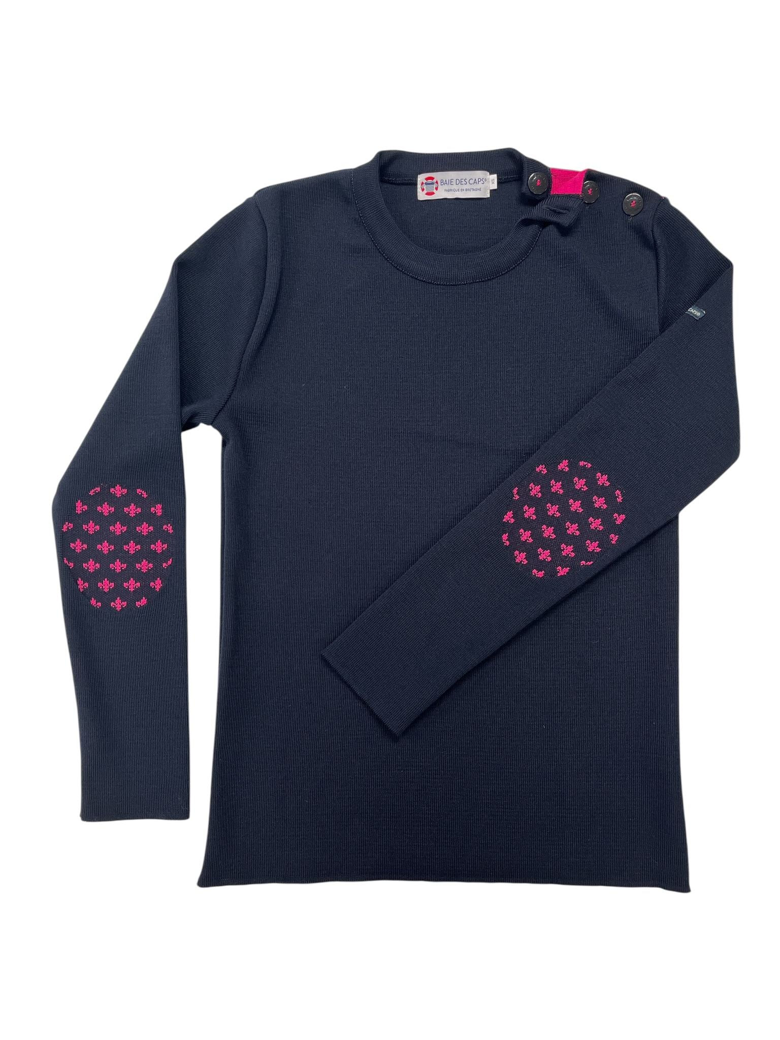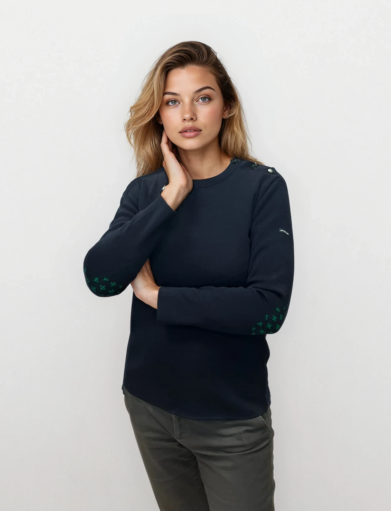 Kombinieren Sie feminine Eleganz und maritimes Erbe mit dem PEN LAN , unserem Matrosenpullover für Damen in neuer Auflage mit modernisierten Fleur de Lys-Ellbogenflicken .