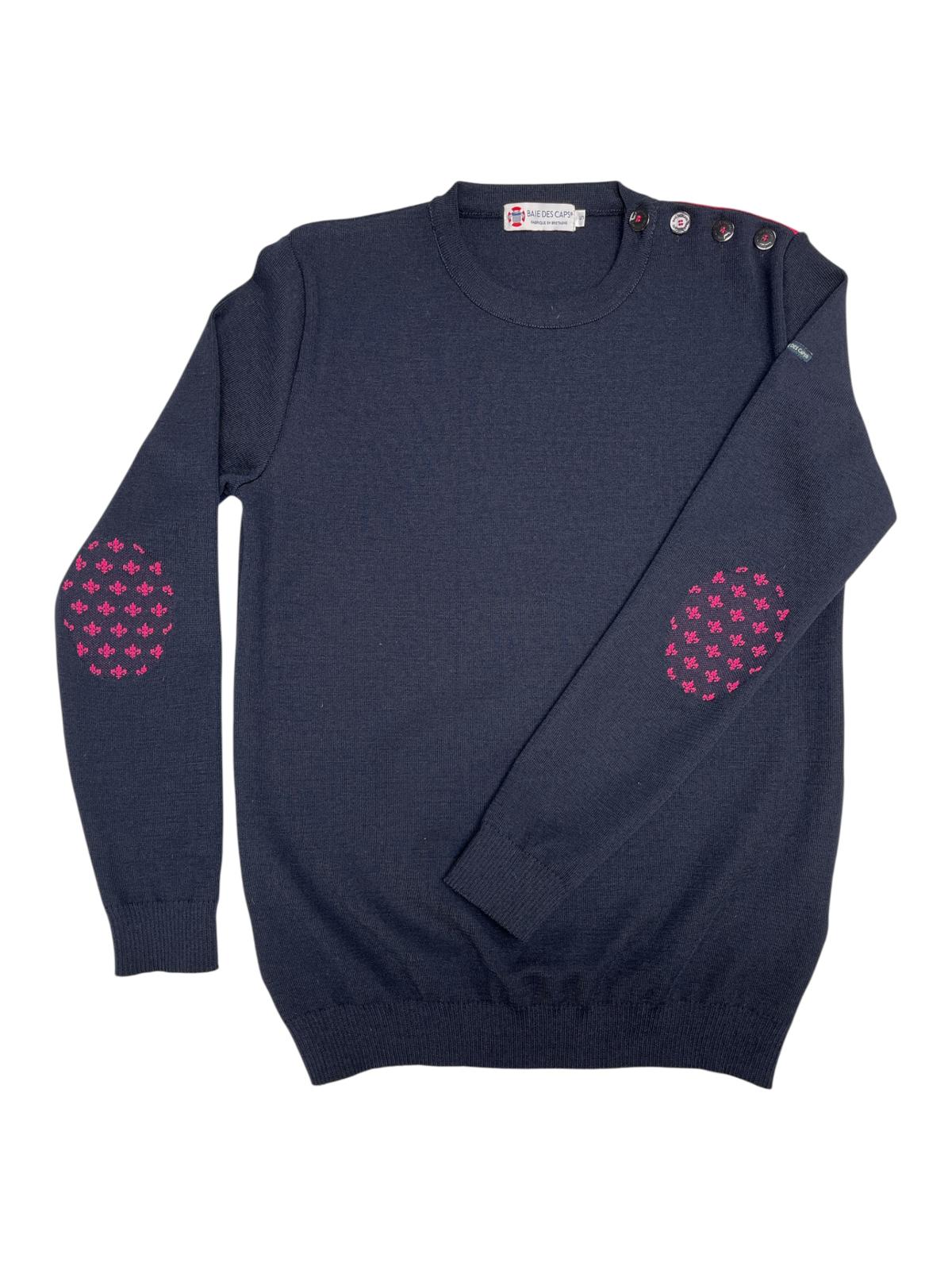Knitted in pique stitch on each elbow pad, this graphic signature stands out as an emblematic detail of our know-how. It recalls fortified ports, sailors' tales, and the attachment to local traditions revisited with audacity.