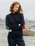 Fall for the revisited navy blue sailor sweater in pure virgin wool , the result of a collaboration between Baie des Caps and Augustin . The original elbow patches , inspired by Augustin's emblematic patterns, bring a feminine and charming touch to this timeless classic.